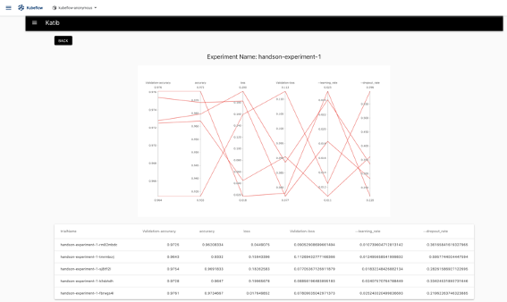 - Katib: 하이퍼 파라미터 튜닝을 자동으로 해주는 기능이다. 아래 그림과 같이 하이퍼 파라미터를 바꾸면서 결과를 그래프와 표로 보여준다.
