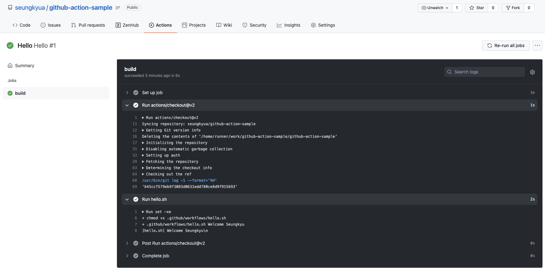 웹 브라우저로 repository https://github.com/seungkyua/github-action-sample 에 접속하여 Action 탭의 build 를 클릭해보면 아래의 화면 처럼 '[hello.sh] Welcome Seungkyu\n' 가 출력되어 있음을 알 수 있다.
