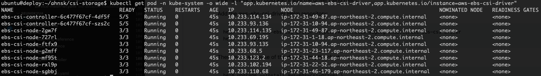 kustomize 로 설치하면 ebs-csi-controller 가 HA 로 설치되고, 각 노드 마다 ebs-csi-node 가 설치된다. 이는 ceph 스토리지 용도의 CSI Driver 와도 비슷한데 volume 을 사용할 Pod 가 실행될 VM 노드에 EBS 링크를 연결하고 이를 Pod 에서 사용하기 때문에 각 노드마다 ebs-csi-node 가 설치되는 이유이다.