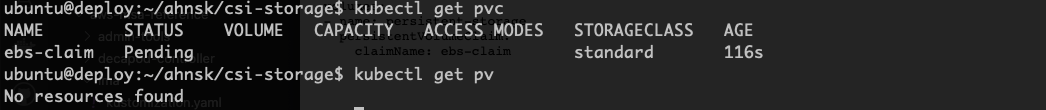 standard (default) ebs.csi.aws.com Delete WaitForFirstConsumer false 138m