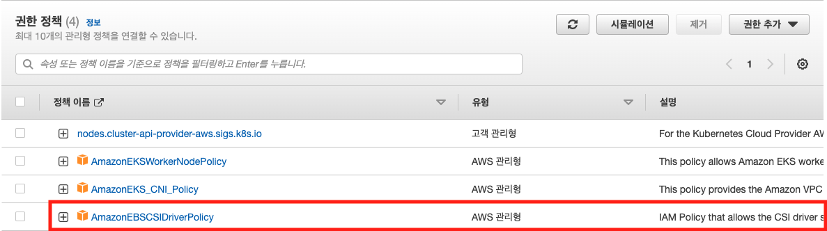 앞에서 VM 에 ebs 링크를 걸어준다고 했는데 그렇기 때문에 IAM 설정을 해야 한다. 아래와 같이 Policy 를 만들고 해당 Policy 를 control-plane.cluster-api-provider-aws.sigs.k8s.io 과 nodes.cluster-api-provider-aws.sigs.k8s.io 에 attach 해야 한다.
